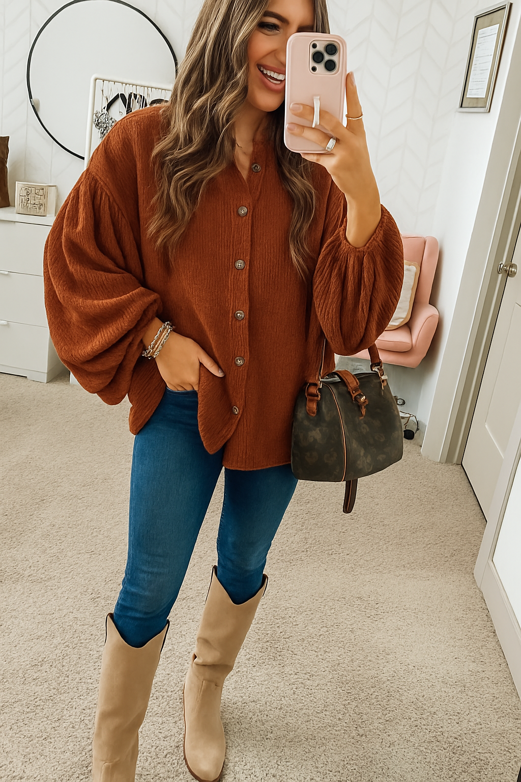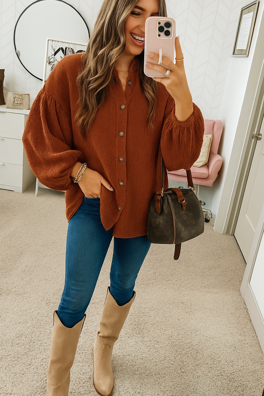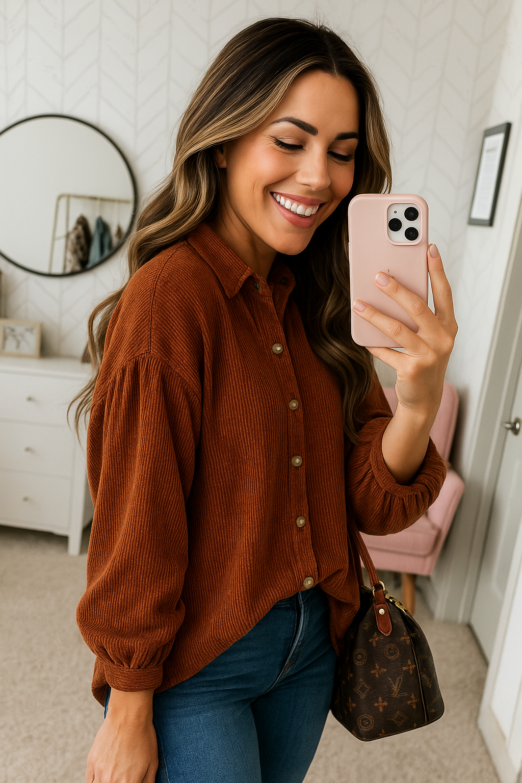 Experience the epitome of stylish warmth with the Textured Corduroy Puff Sleeve Shacket. A delightful fusion of vintage flair and modern sophistication, this shacket seamlessly blends the coziness of a jacket with the laid-back charm of a shirt. The plush corduroy texture imparts an air of elegance, while the puff sleeves add a dash of contemporary chic. Whether you're stepping out for a casual brunch or cozying up by the fireplace, this piece is bound to elevate your fashion game.