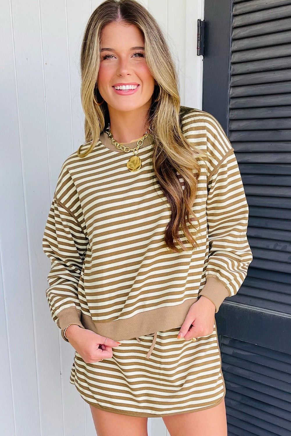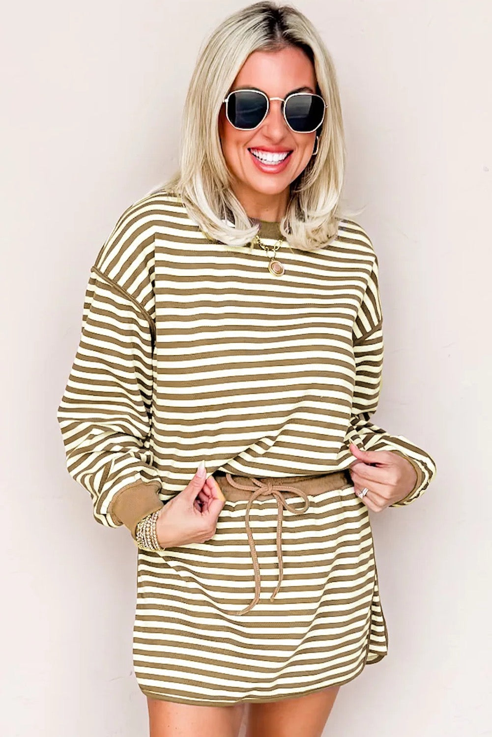 The Cozy Stripes Lounge Set features a soft ribbed fabric with classic neutral striping, a relaxed long-sleeve top, and a matching mini skirt with an adjustable drawstring waist. Designed for easy wear and all-day comfort, this set is perfect for running errands, casual weekends, or lounging in style. Wear it together for a complete look or mix and match with your favorite basics.
